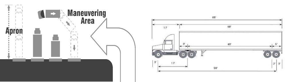 Traffic flow and vehicle length are key factors for consideration (ie. a truck with an overall length of 65' requires a minimum apron space of 135’).