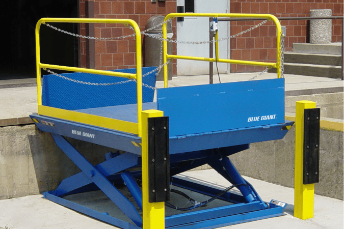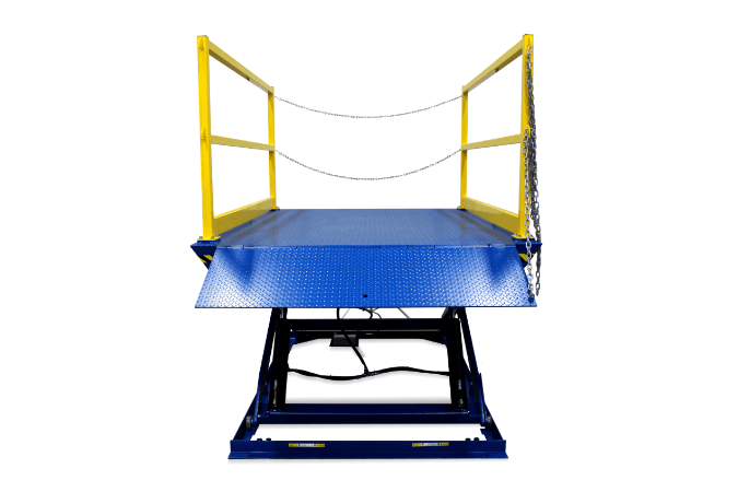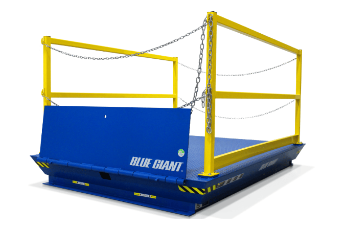 A full-length deck beam ensures maximum support, and solid plate steel legs support maximum rigidity. The precision safety velocity fuses on the hydraulic cylinders limit platform free-fall. Each dock lift comes equipped with handrails, a 4" (102 mm) kick plate, and a barrier chain across each end.- Loading Dock Solutions Brochure BlueGiant.General.DocumentOnlyAvailableEnglish