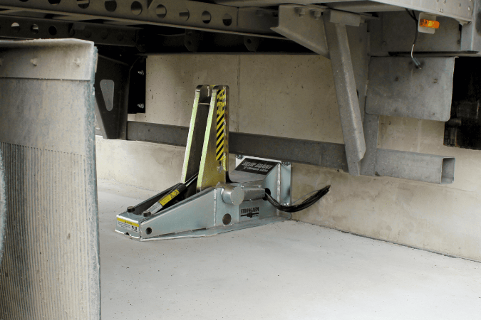 Once engaged, it uses 35,000 lb (15,909 kg) of restraining force to secure the truck to the dock. Dual-acting hydraulic cylinders prevent lock-up and release problems.