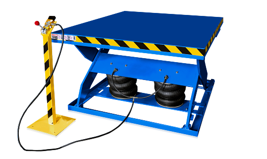 What are the benefits of a pneumatic lift table from Blue Giant? All our units are 100% air actuated and can be used anywhere plant air is available, making them ideal for applications where hydraulic equipment (oils and fluids) is prohibited. They require less maintenance than electric hydraulic units with no direct electrical connections, control boxes, or hydraulic cylinders. Here are some product highlights: